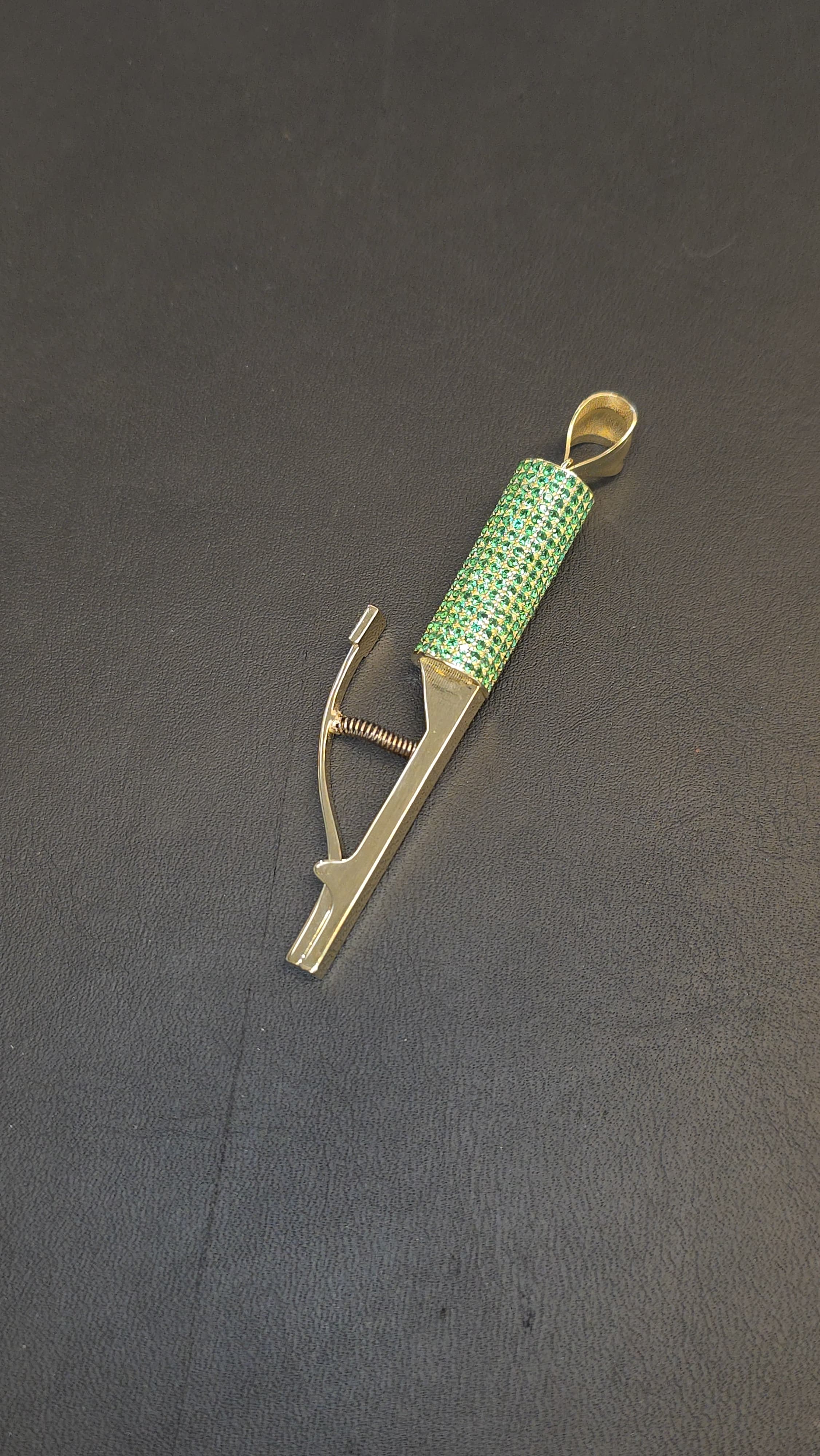 Crafted in 10K gold, this welder‑tool–inspired pendant is designed for those who take pride in their craft. With its bold industrial silhouette and vibrant green CZ stones, this piece delivers a unique look that represents strength, skill, and dedication to the welding trade.