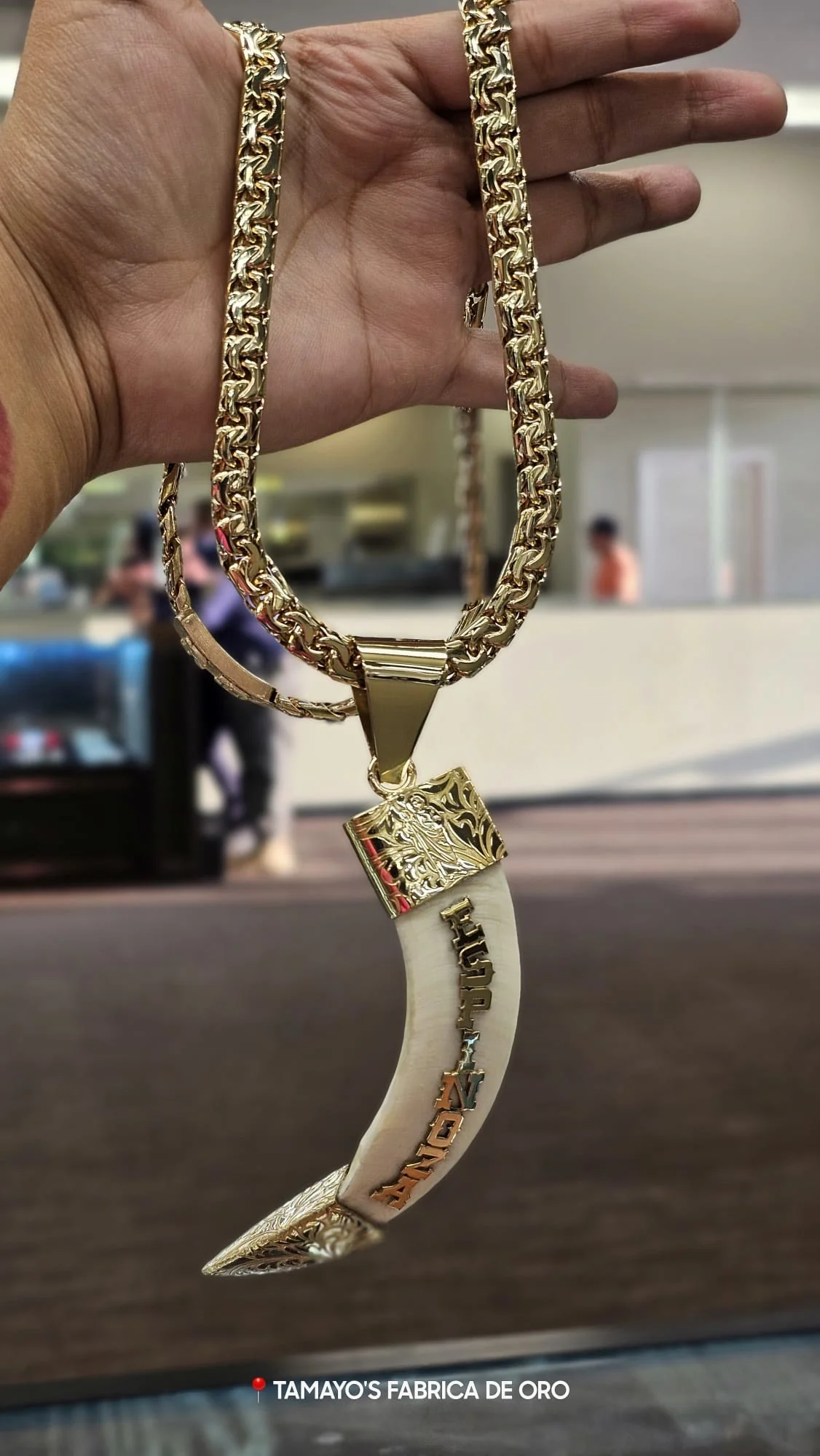 Welcome to TamayosGold.com, your ultimate destination for unique and timeless jewelry pieces. We are thrilled to present our latest creation, the Javelin Tusks - a true testament to old-school craftsmanship and elegance. Featuring stunning gold letters and intricate engravings, each Javelin Tusk is meticulously handcrafted with care and precision. Made from approximately 40grams of 10k gold, this full custom piece is a true work of art that will captivate all who behold it. At an unbeatable price of only $2399, the Javelin Tusks offer unparalleled value for such a masterpiece. We take pride in our ability to provide exceptional quality at an affordable price, ensuring that our customers receive the best value for their investment. Please note that if you desire additional gold for your Javelin Tusk, it may result in an adjustment to the overall cost. Our dedicated team of skilled artisans will be happy to accommodate your preferences and provide you with a personalized quote based on your specific requirements. With TamayosGold.com, the possibilities are endless. We offer nationwide shipping, allowing you to enjoy the beauty of our Javelin Tusks no matter where you are located. Embrace the timeless allure and elegance of this extraordinary piece, and make a statement that lasts a lifetime. Discover the artistry of Javelin Tusks today at TamayosGold.com - where craftsmanship meets affordability.