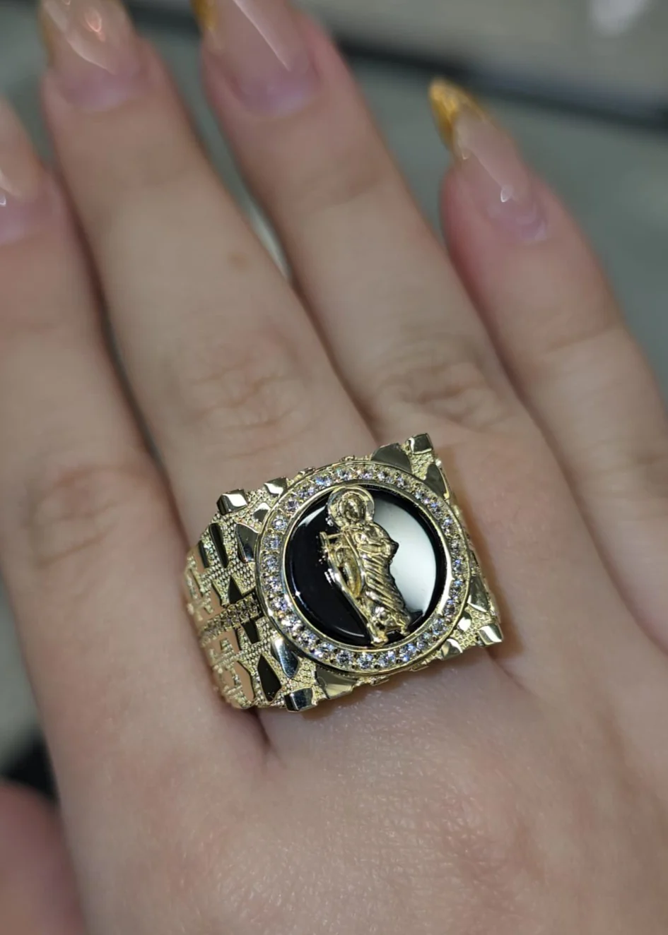 Make a bold statement with this exquisite 10k Nugget Ring. Featuring a striking black rock centerpiece adorned with a beautifully crafted Saint Jude emblem, this piece symbolizes faith and protection in timeless style. Surrounding the centerpiece, a shimmering array of white cubic zirconias adds a touch of elegance and brilliance. The nugget-style band design enhances the ring's unique character, offering texture and depth that stands out. With an approximate weight of 8 grams, this ring combines substance with sophistication, making it a stunning accessory for any occasion.